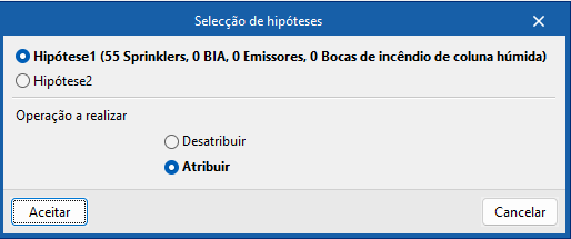 Permite selecionar uma das hipóteses de cálculo definidas para efetuar o seu cálculo. Entre parêntesis é apresentado o número de sprinklers, BIA, emissores e bocas de saída de coluna húmida atribuídos à hipótese.