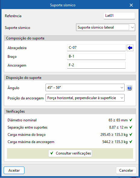 - Suportes sísmicos (desde "Suportes sísmicos", "Novo") [no caso de realizar o cálculo sísmico].