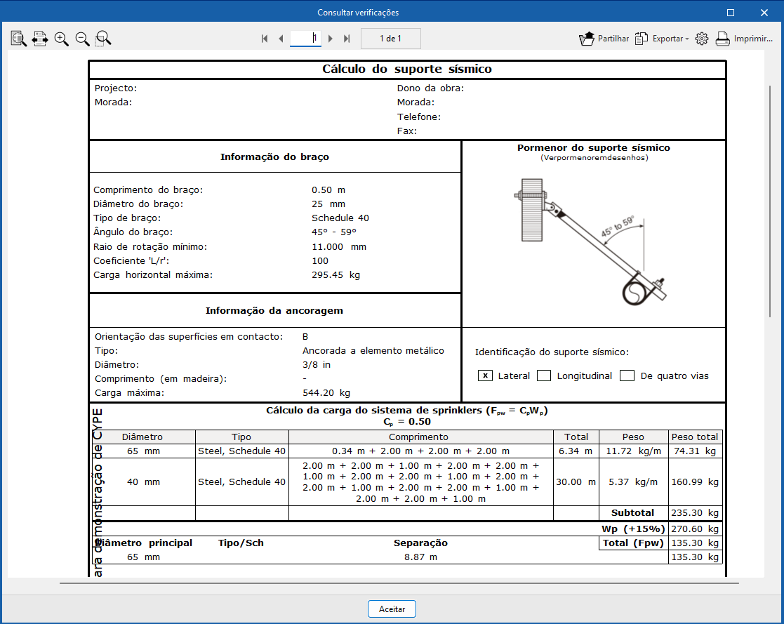 Nestas listagens são detalhadas as expressões de cálculo e a descrição de cada verificação, assim como as magnitudes calculadas e os limites de valores estabelecidos.