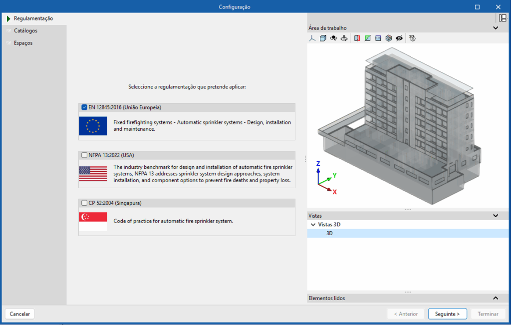 Assistente de configuração: seleção da regulamentação, descarga de catálogos e classificação dos espaços