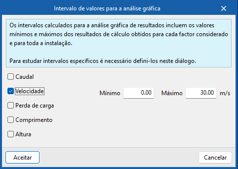 Através da opção "Análise gráfica de resultados" do grupo "Cálculo" da barra de ferramentas principal, são visualizados os valores calculados de diferentes magnitudes com os tramos da instalação de distribuição de água marcados com cores.