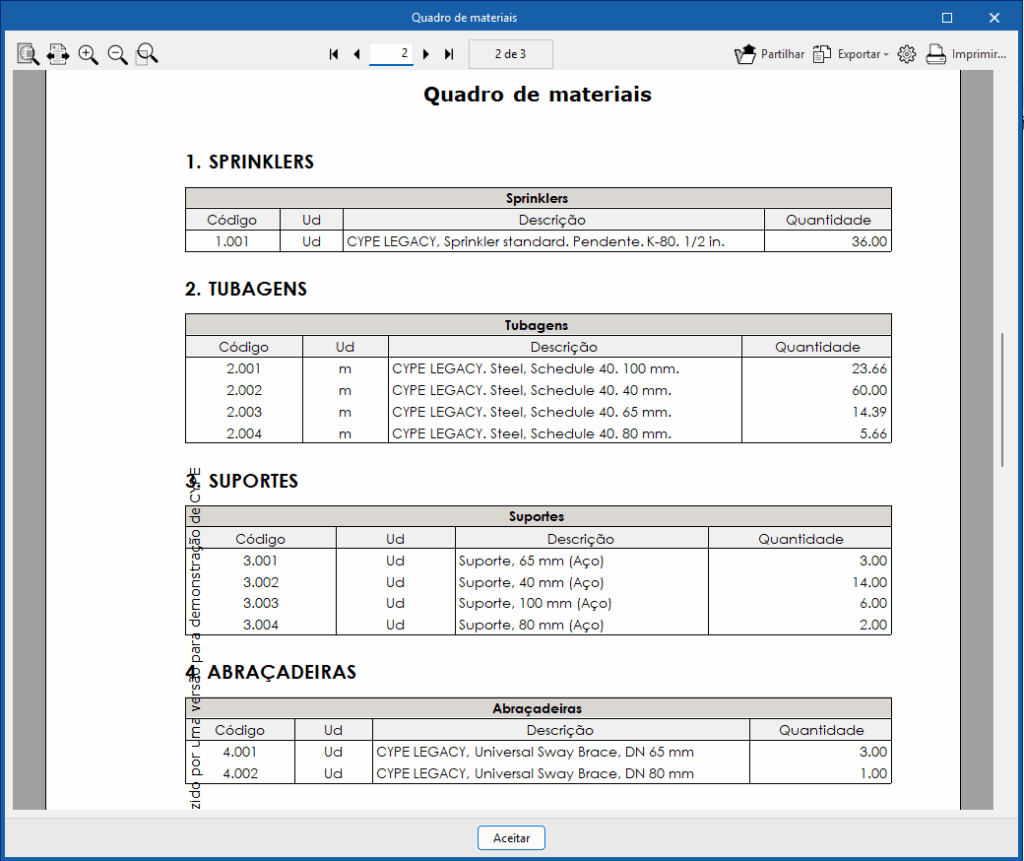 Apresenta o quadro de materiais com a medição dos elementos dispostos na instalação.