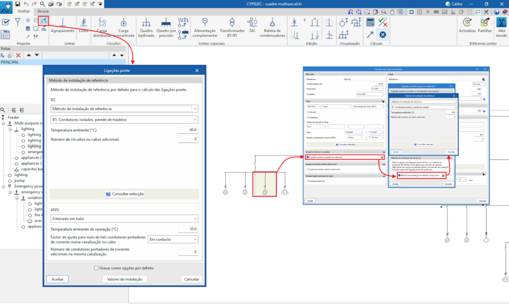 - Definição e introdução dos elementos do esquema unifilar da instalação elétrica de baixa tensão. Isto pode ser feito de várias formas: