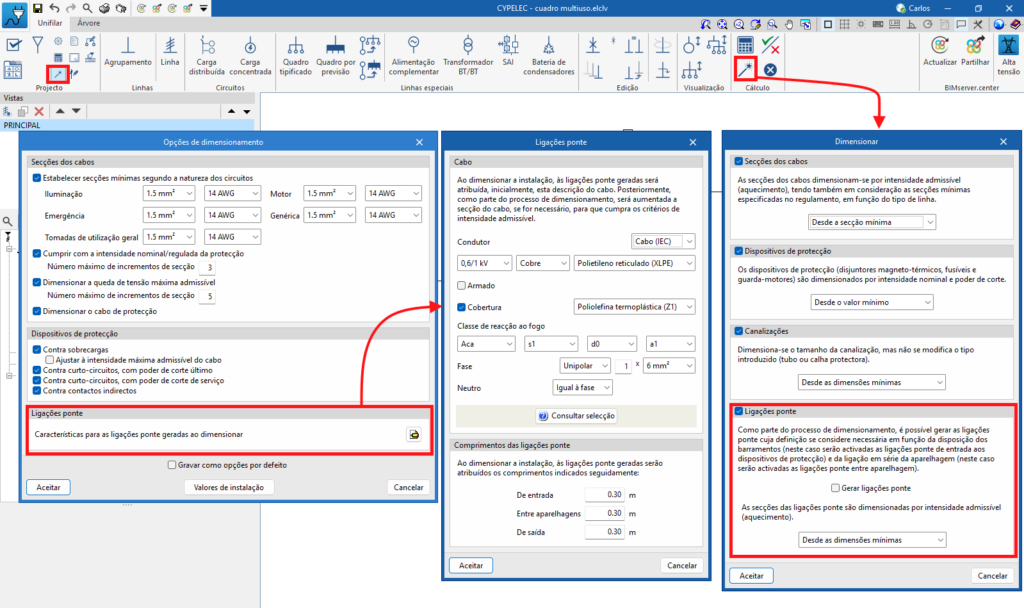 - Revisão das opções de configuração, cálculo e dimensionamento (a partir de "Projeto", "Configuração"/"Opções de cálculo"/"Opções de dimensionamento").