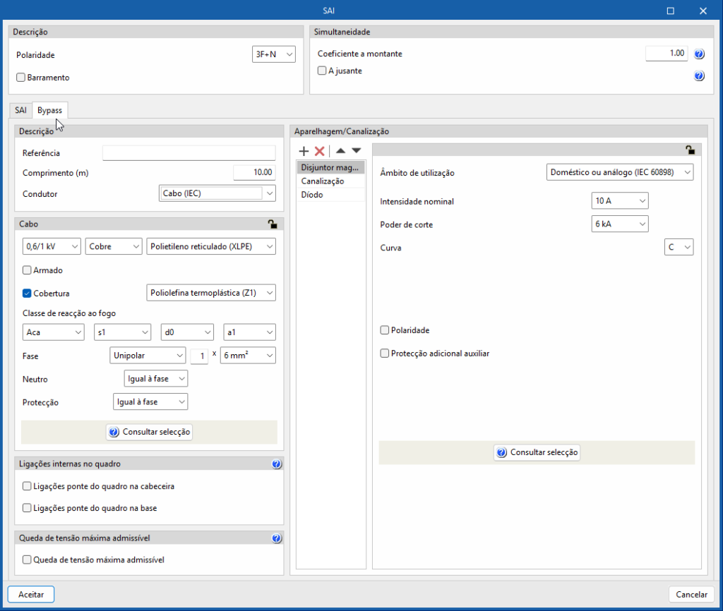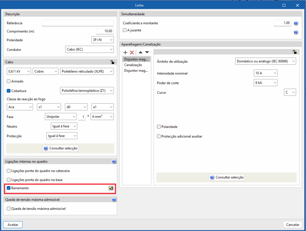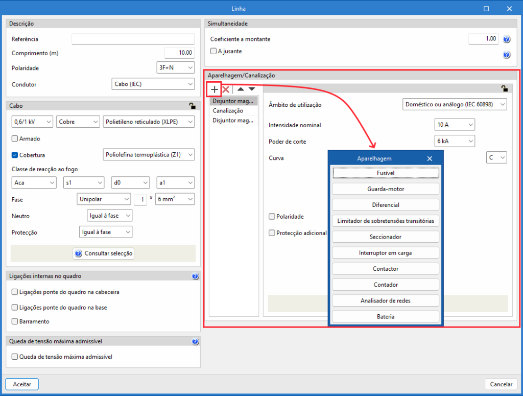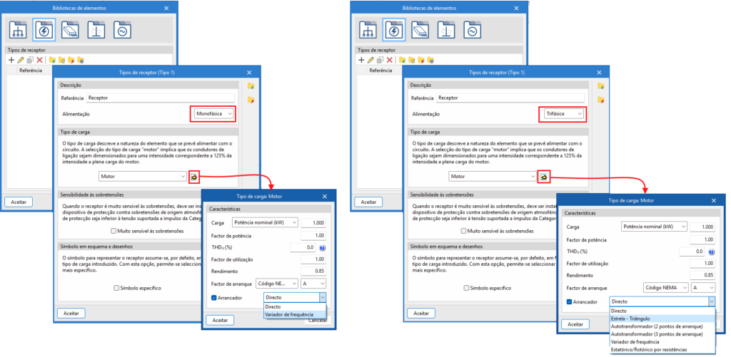O arrancador selecionado, para além de afetar o cálculo, reflete-se no diagrama unifilar com o seu ícone correspondente.