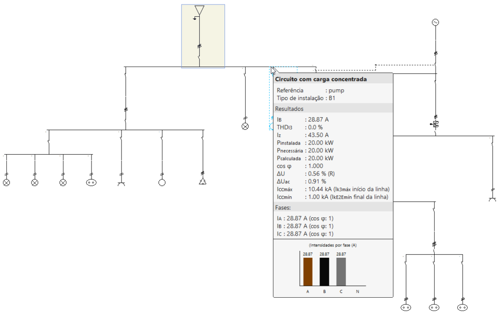 Depois de realizar o cálculo, o programa apresenta em ecrã os resultados e grandezas calculados através de un tooltip que aparece ao posicionar o cursor sobre um elemento da instalação.