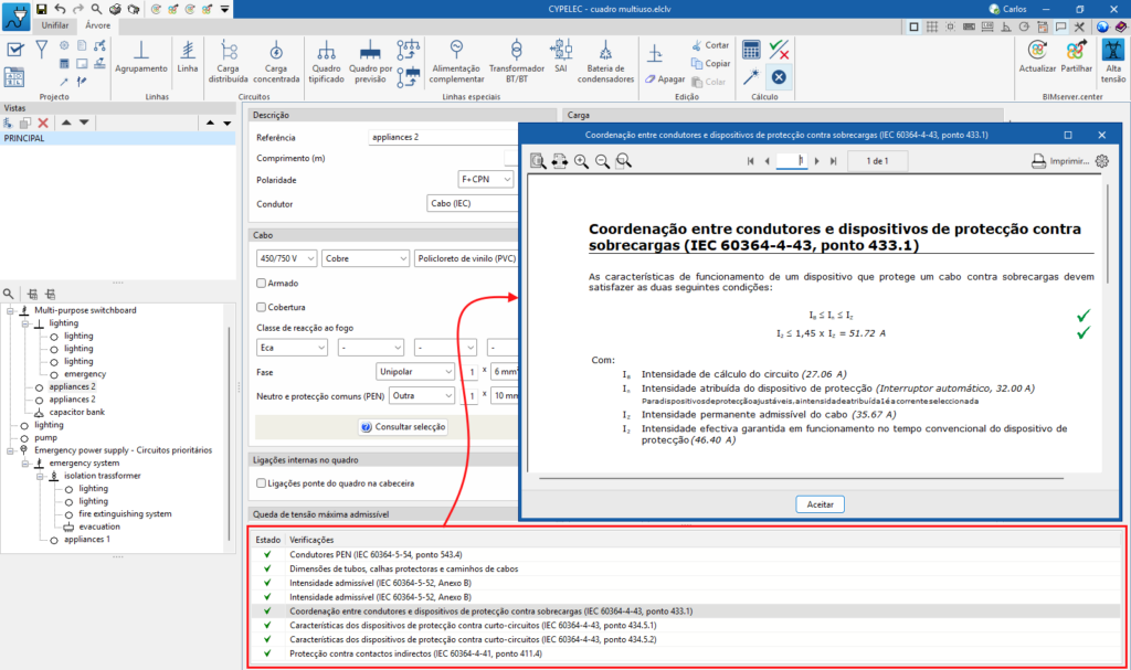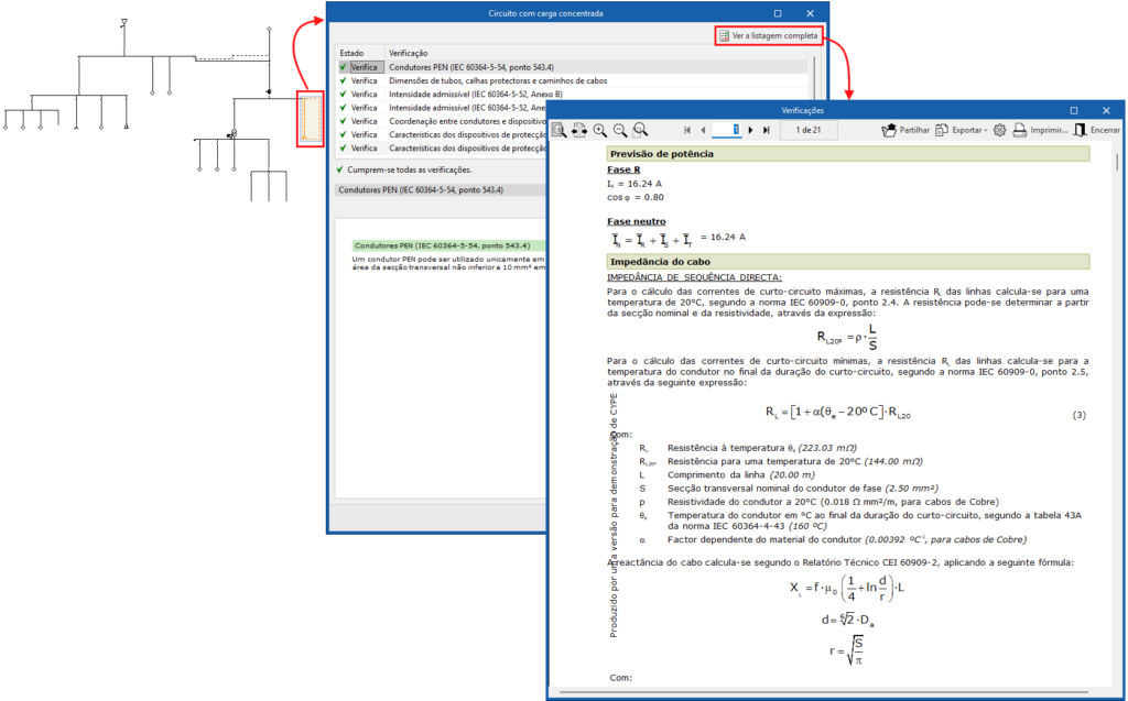 No separador "Unifilar", ao clicar sobre um elemento, o programa permite consultar as listagens de cálculo e de verificações detalhadas realizadas sobre o mesmo.