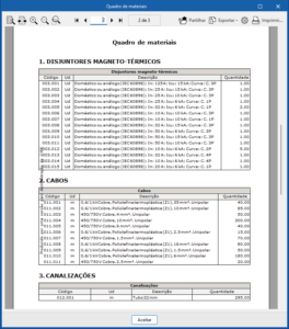 Apresenta um relatório com o quadro de materiais utilizados na instalação. Os dados dos disjuntores magneto-térmicos, fusíveis, guarda-motores, arrancadores, diferenciais, cabos, canalizações e outros elementos da instalação (como os contadores ou caixas de derivação) são organizados numa série de tabelas que incluem a seguinte informação:- Código
