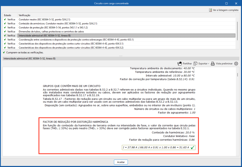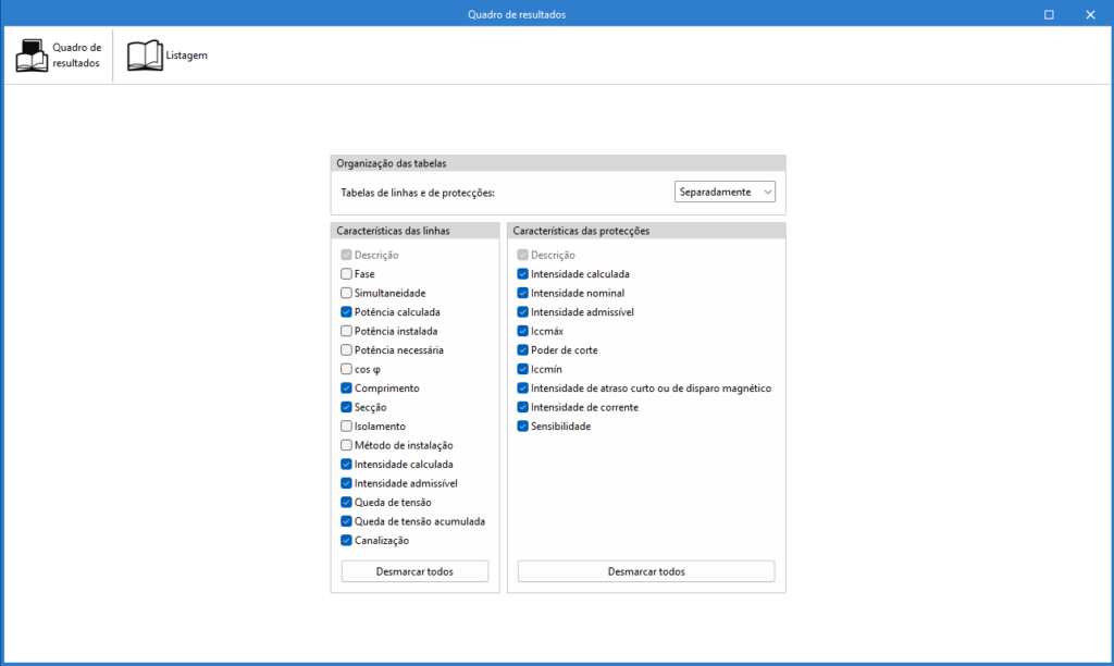 Apresenta um relatório com os resultados de cálculo da instalação. Esta listagem inclui a informação mais relevante para cada uma das linhas, assim como os resultados das verificações realizadas, permitindo ao utilizador decidir quais os dados que aparecem nas tabelas e quais os que não aparecem. O programa permite configurar a seguinte informação:- Organização das tabelas de linhas e de proteções (Juntamente / Separadamente)