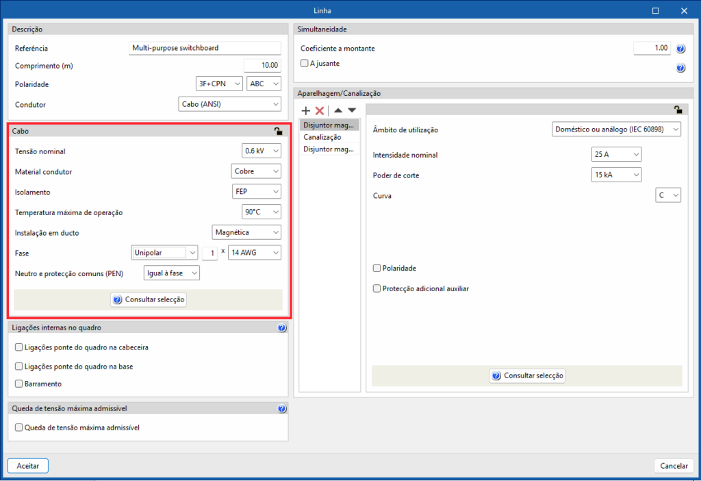 - Quedas de tensão (Queda de tensão, Queda de tensão acumulada)