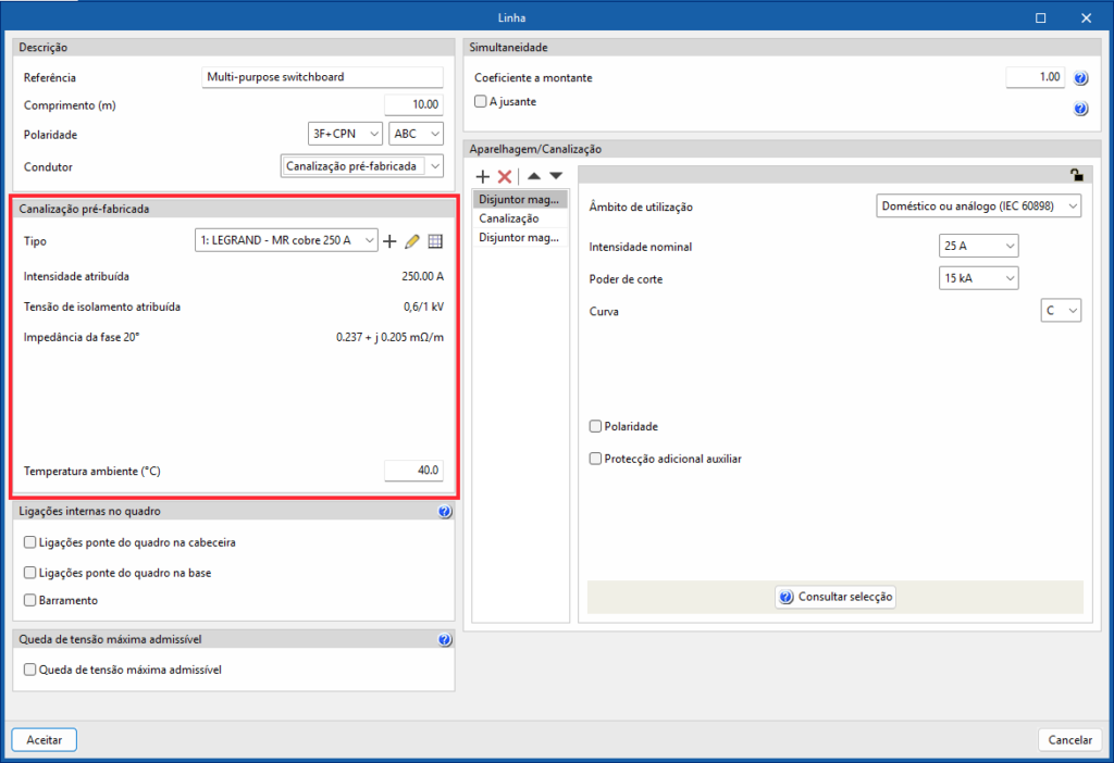 Estas opções permitem configurar as características gerais do projeto, as condições de alimentação e as bibliotecas de elementos utilizados, ajustar o cálculo e o dimensionamento, assim como a apresentação da informação em ecrã e nos desenhos.