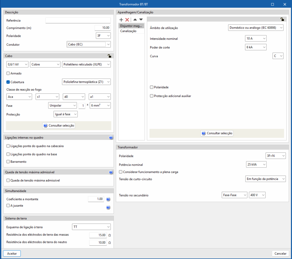 Permite definir o esquema de ligação à terra da instalação e os parâmetros que o caracterizam: