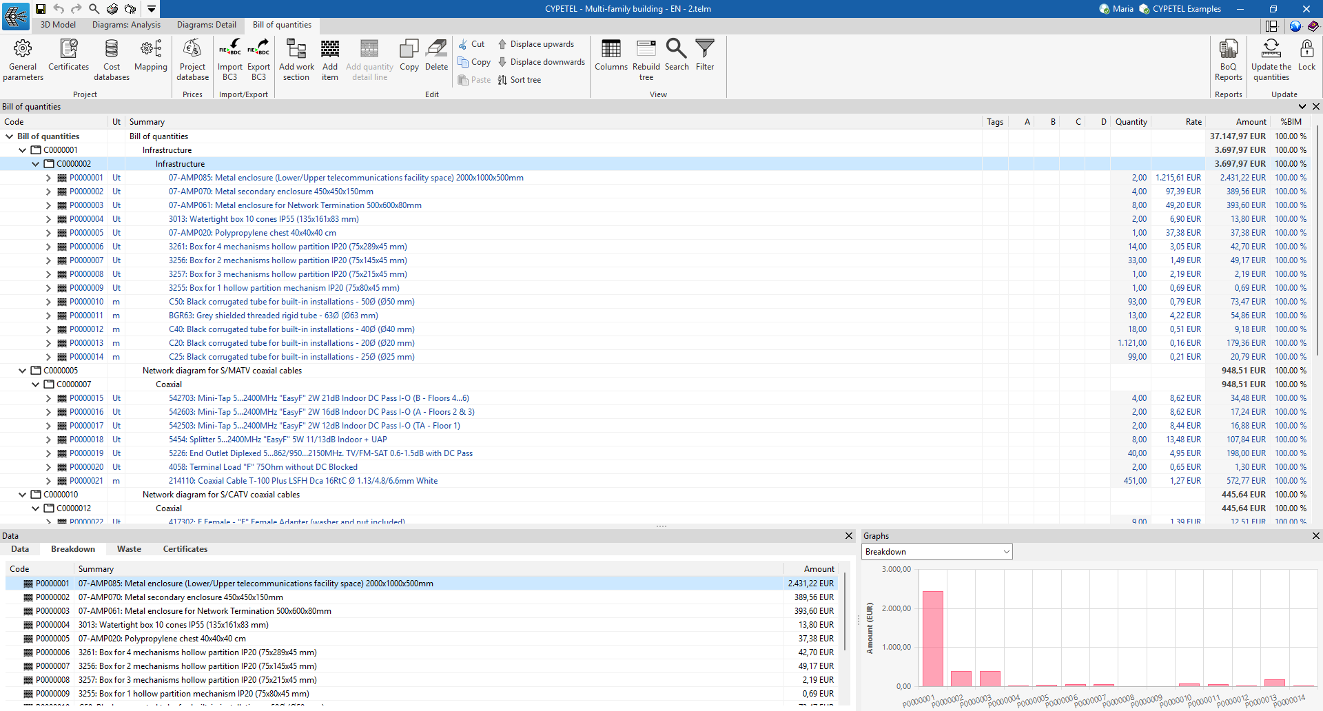 Por outro lado, o separador "Orçamento" permite gerir a medição e o orçamento das instalações de telecomunicações, apresentando: