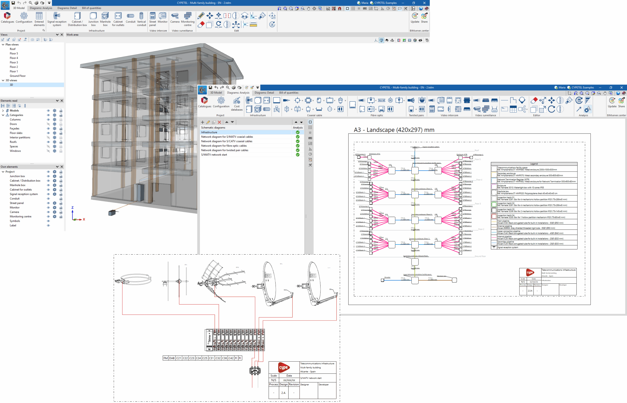 O CYPETEL é um programa especializado no cálculo e conceção de instalações de telecomunicações a partir de catálogos de fabricantes. Dispõe das ferramentas para realizar a modelação BIM da infraestrutura de telecomunicações e permite realizar a conceção e cálculo dos esquemas da rede de infraestruturas e dos esquemas das redes de cabos coaxiais, cabos de fibra ótica, híbridas de fibra-coaxial (HFC), cabos de pares de cobre, videoporteiros e videovigilância. Oferece também a possibilidade de criar composições gráficas de pormenores das instalações para facilitar a conceção de bastidores ou de cabeças de rede, incluindo a possibilidade de gerar o orçamento da instalação, assim como a documentação do Projeto de Infraestruturas de Telecomunicações em Edifícios (ITED) e do Projeto de Infraestruturas de Telecomunicações em Loteamentos, Urbanizações e Conjuntos de Edifícios (ITUR).