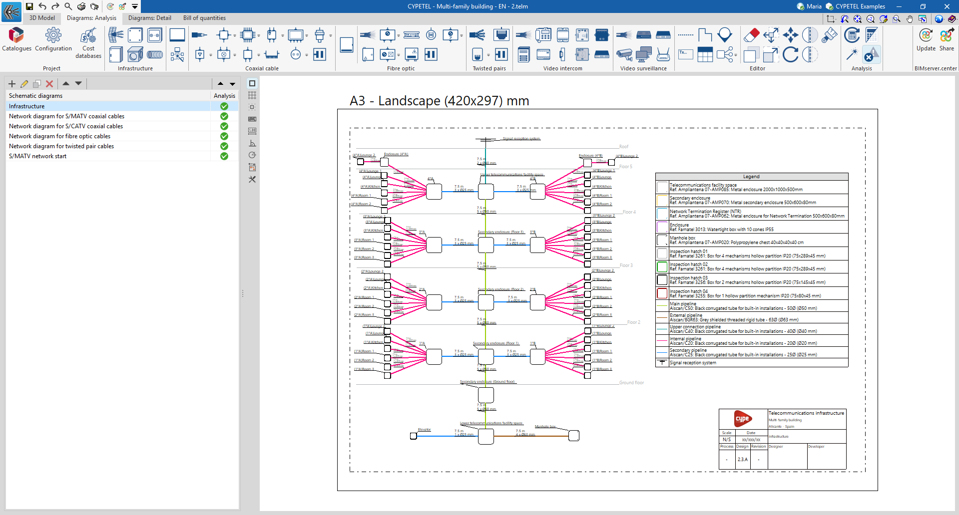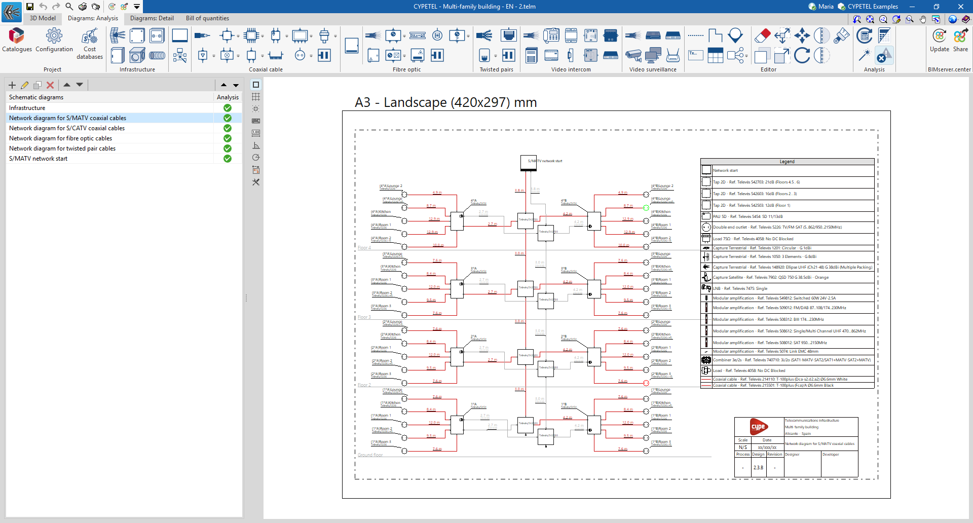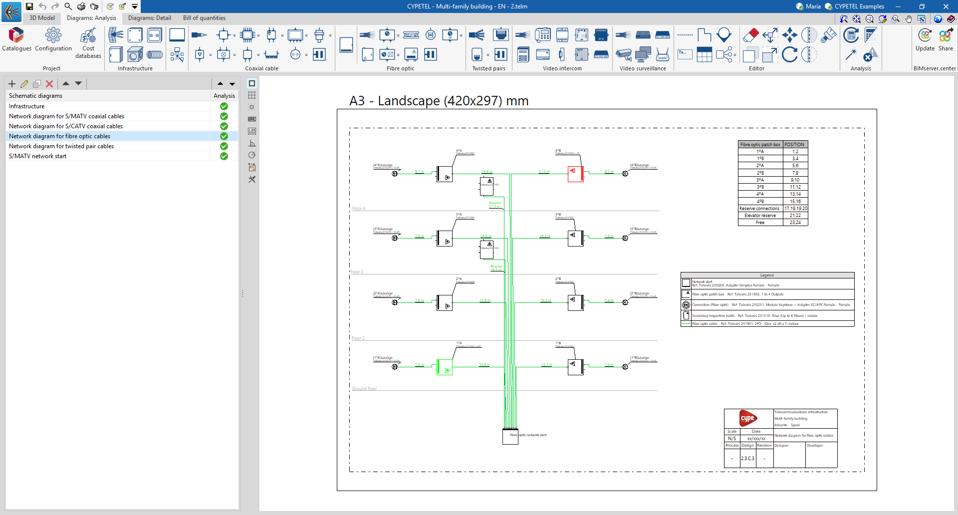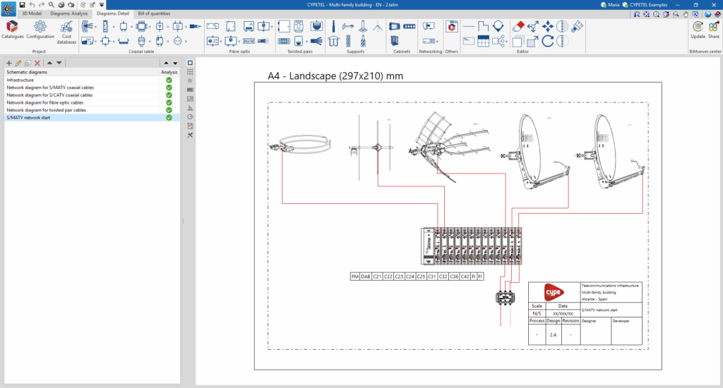 O CYPETEL permite gerar os desenhos dos esquemas das redes de telecomunicações, estes podem ser enviados para um periférico de impressão ou exportados para diferentes formatos como DWG, DXF ou PDF, entre outros.