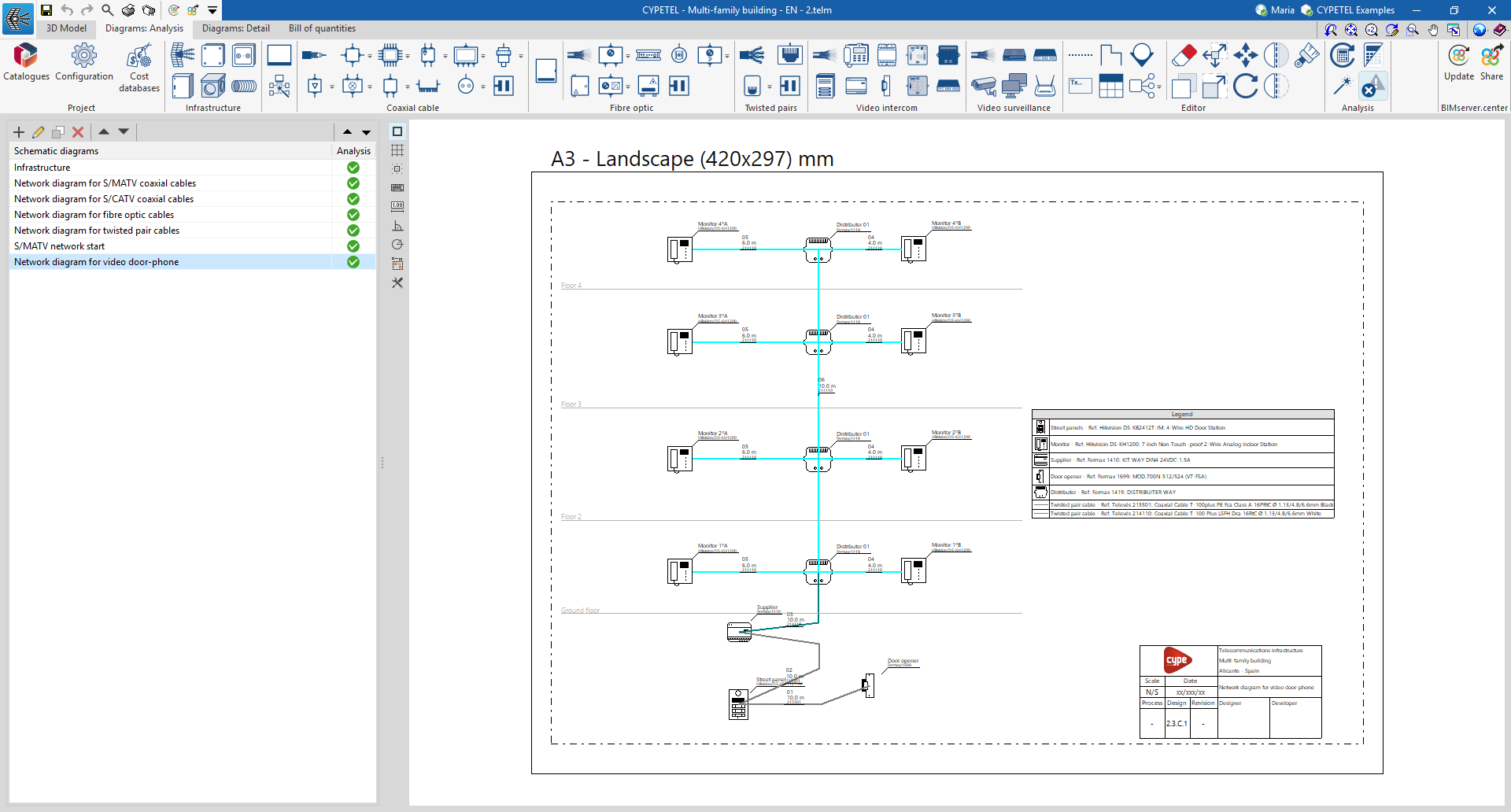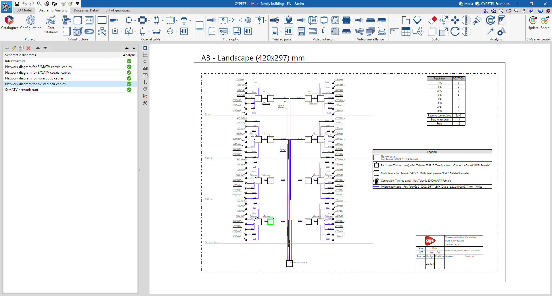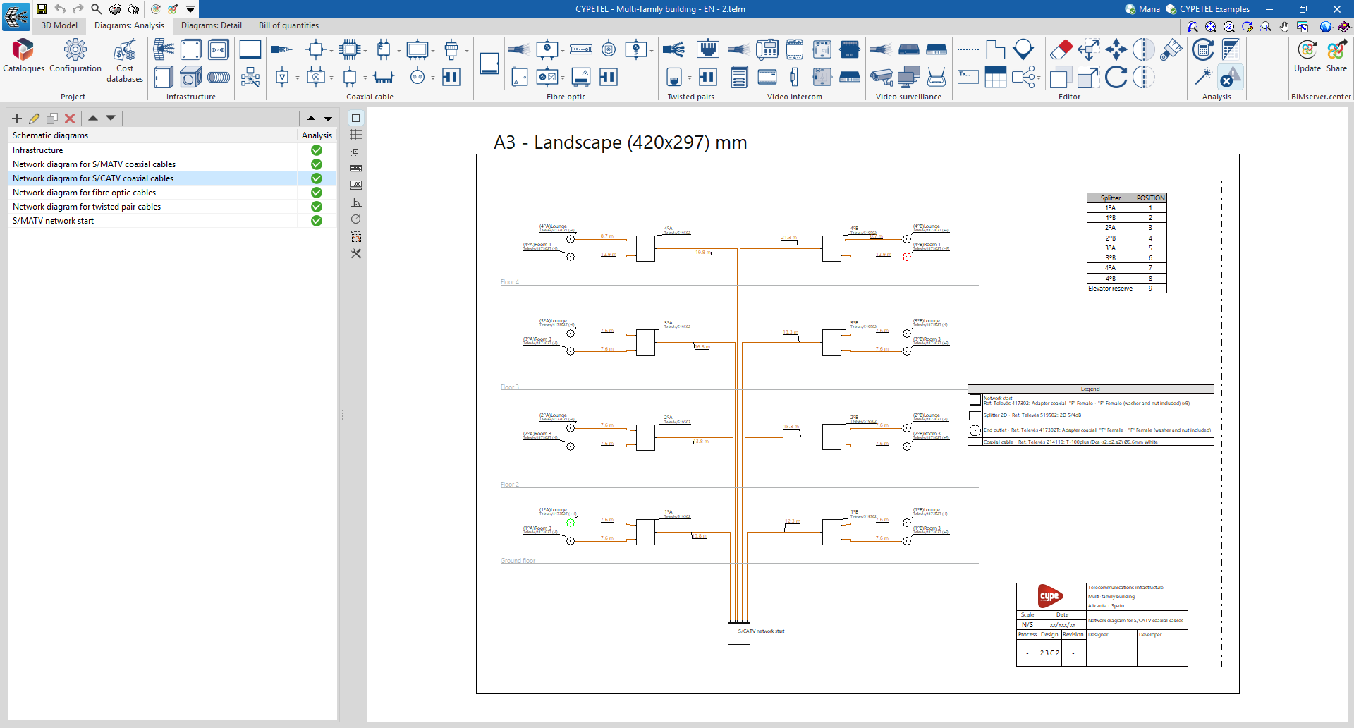 O CYPETEL permite gerar os desenhos dos esquemas das redes de telecomunicações, estes podem ser enviados para um periférico de impressão ou exportados para diferentes formatos como DWG, DXF ou PDF, entre outros.