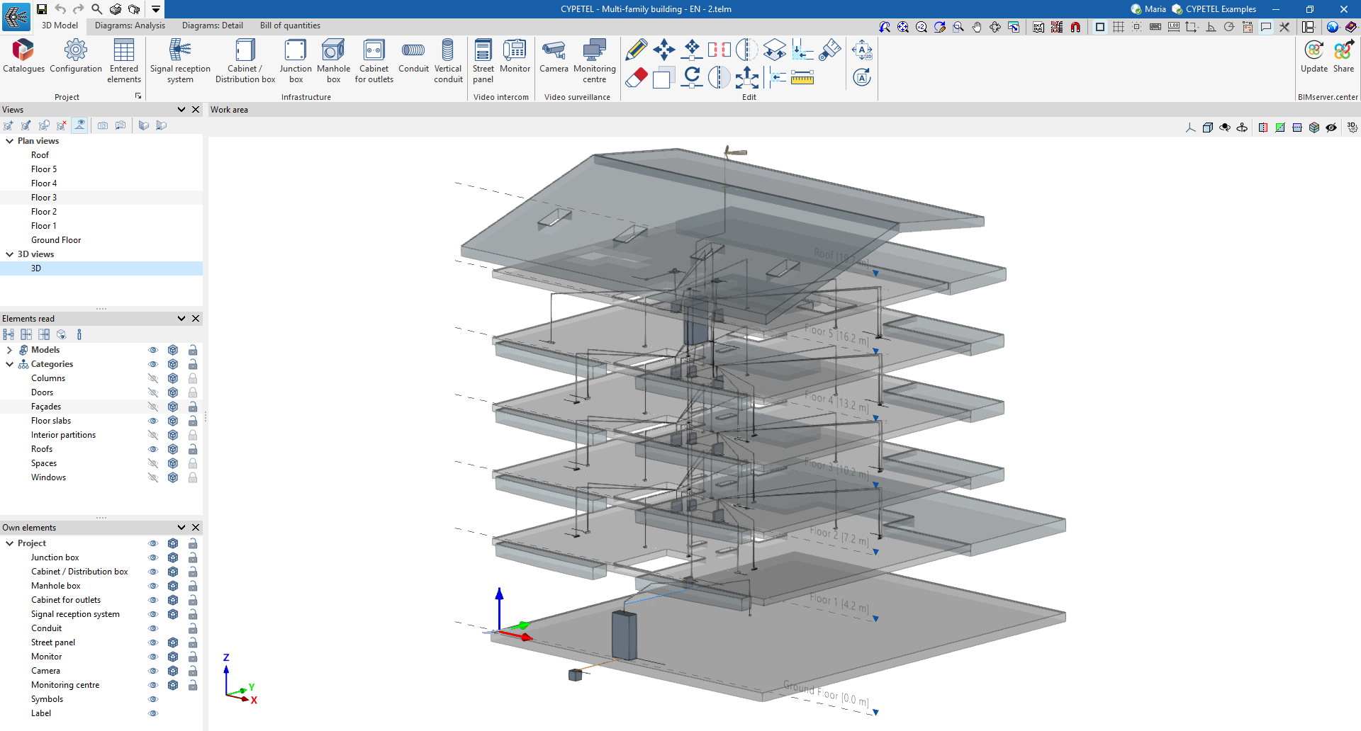 - Exportação da informação gerada com o CYPETEL para a plataforma BIMserver.center mediante formatos IFC e glTF. Isto permite que seja visualizada pelos participantes autorizados do projeto.