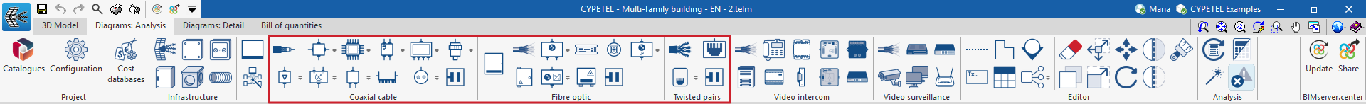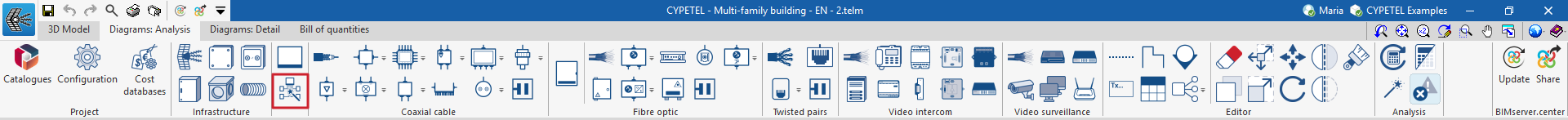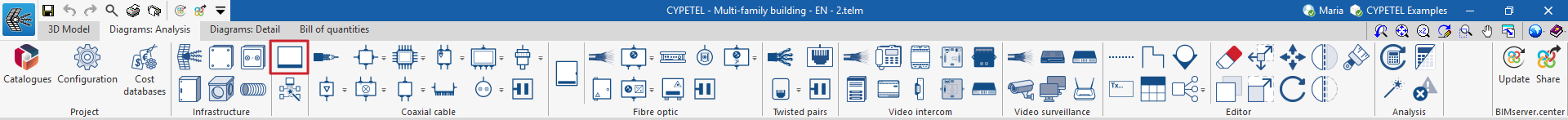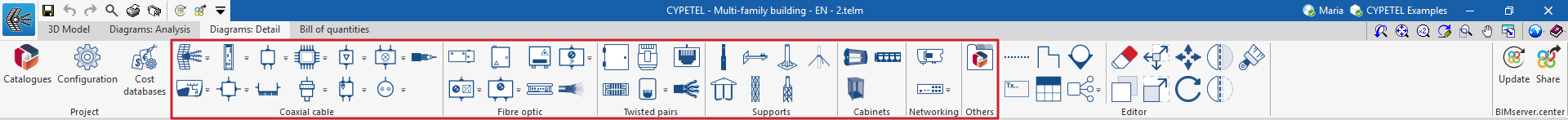 - Na parte superior, todas as ferramentas necessárias para gerir os catálogos e configurar o projeto, introduzir e editar os esquemas da instalação de telecomunicações e realizar o cálculo e verificação da instalação.