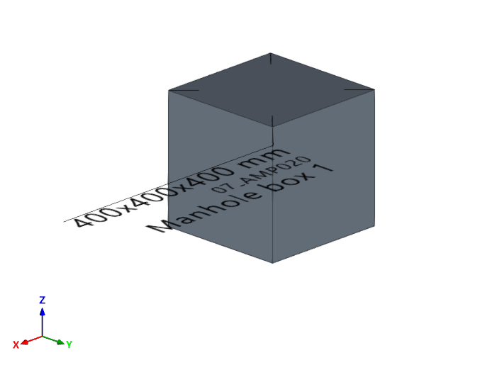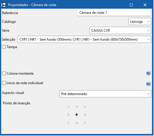 Permite introduzir uma câmara de visita no modelo BIM a partir de um catálogo de fabricante, adicionar uma tampa a partir de um catálogo e configurar as suas preferências de visualização. Além disso, se a instalação tiver várias verticais independentes, é possível definir referência da vertical à qual este elemento pertence.