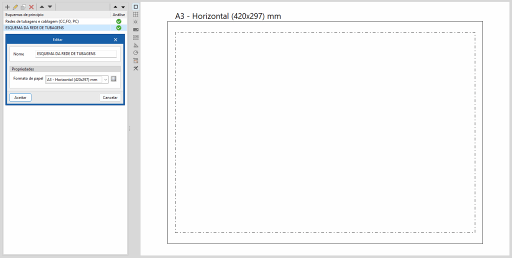 - Na lateral esquerda, um painel de navegação entre os diferentes esquemas de princípio, constituídos folhas de formato e escala editáveis.