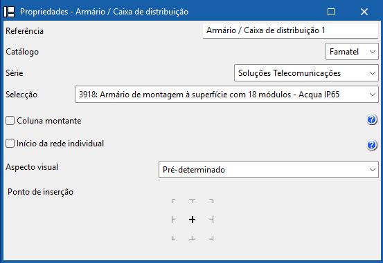 Permite introduzir um armário ou caixa de distribuição a partir de um catálogo de fabricante, diferenciar a parte comum do edifício da parte privativa e estabelecer as suas preferências de visualização. Além disso, se a instalação tiver várias verticais independentes, é possível definir a referência da vertical à qual este elemento pertence.