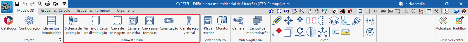 - Introdução dos elementos da infraestrutura de telecomunicações no modelo BIM (separador "Modelo 3D", grupo "Infraestrutura").