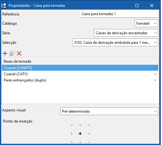 Permite introduzir uma caixa para tomadas no modelo BIM a partir de um catálogo de fabricante. Deve-se indicar as bases de tomada e se são do tipo coaxial, coaxial (S/MATV), coaxial (CATV), pares entrançados, pares entrançados (duplos), fibra ótica ou reserva. Assim como configurar as suas preferências de visualização.