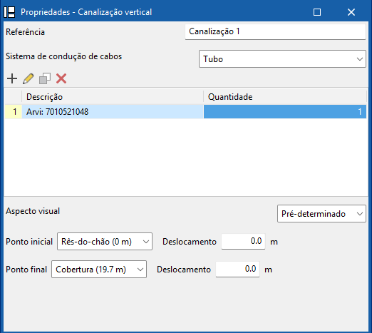 Permite introduzir uma canalização vertical do tipo caminho de cabos, calha ou tubo a partir de um catálogo de fabricante, definir o seu ponto inicial e final, além de configurar as suas preferências de visualização.