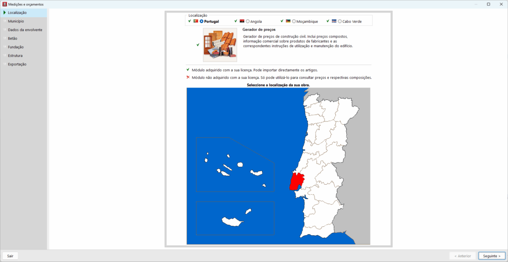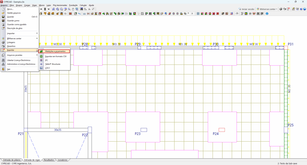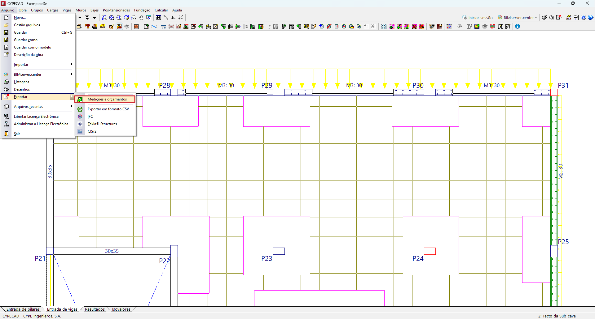 A opção que permite exportar a medição e o orçamento da estrutura calculada encontra-se no menu Arquivo > Exportar > Medições e orçamentos. Surge um assistente onde se define: