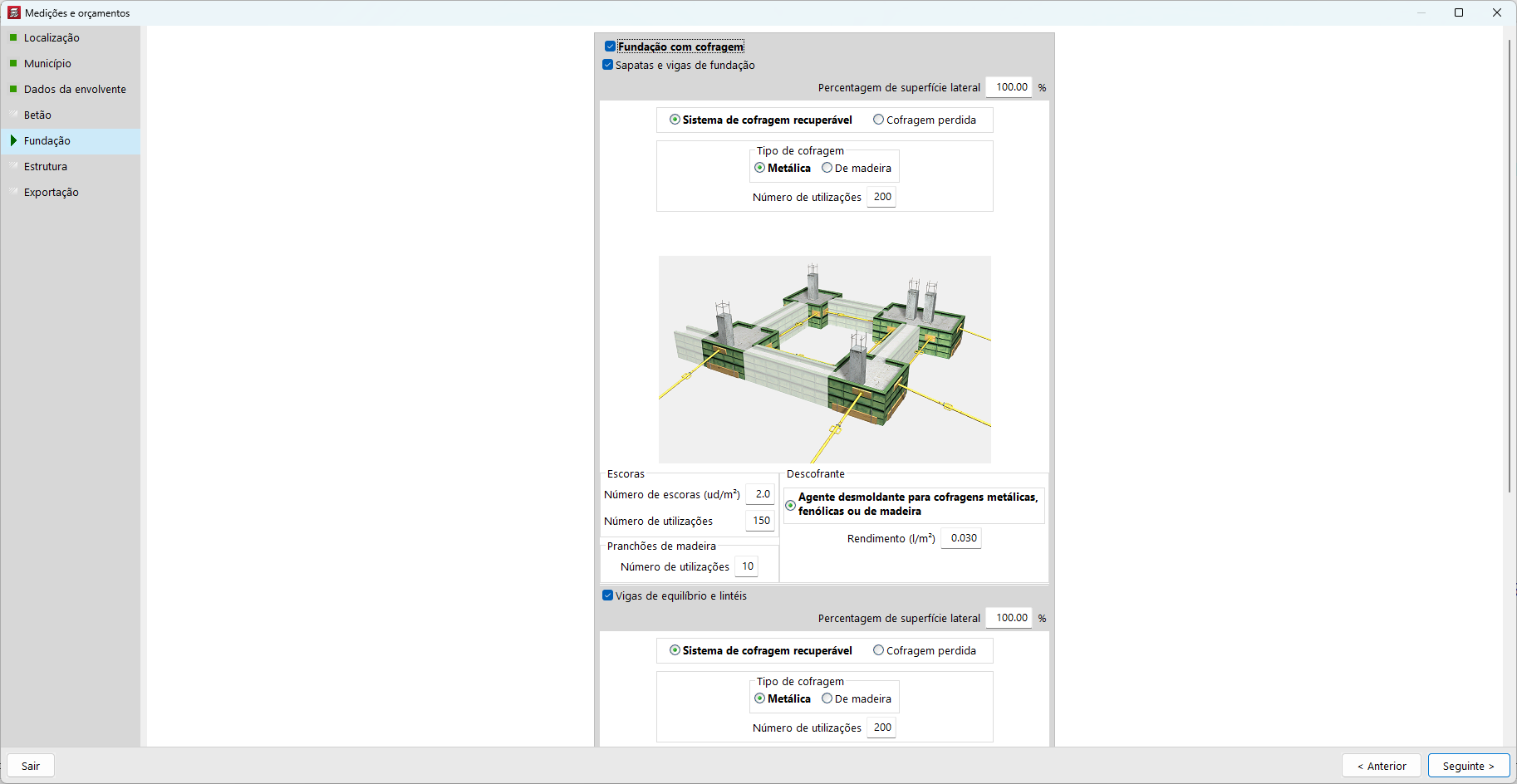 Para que a cofragem da fundação se tenha em conta é necessário ativar-se a opção correspondente. A cofragem dos restantes elementos resistentes da estrutura inclui-se no preço dos mesmos.
