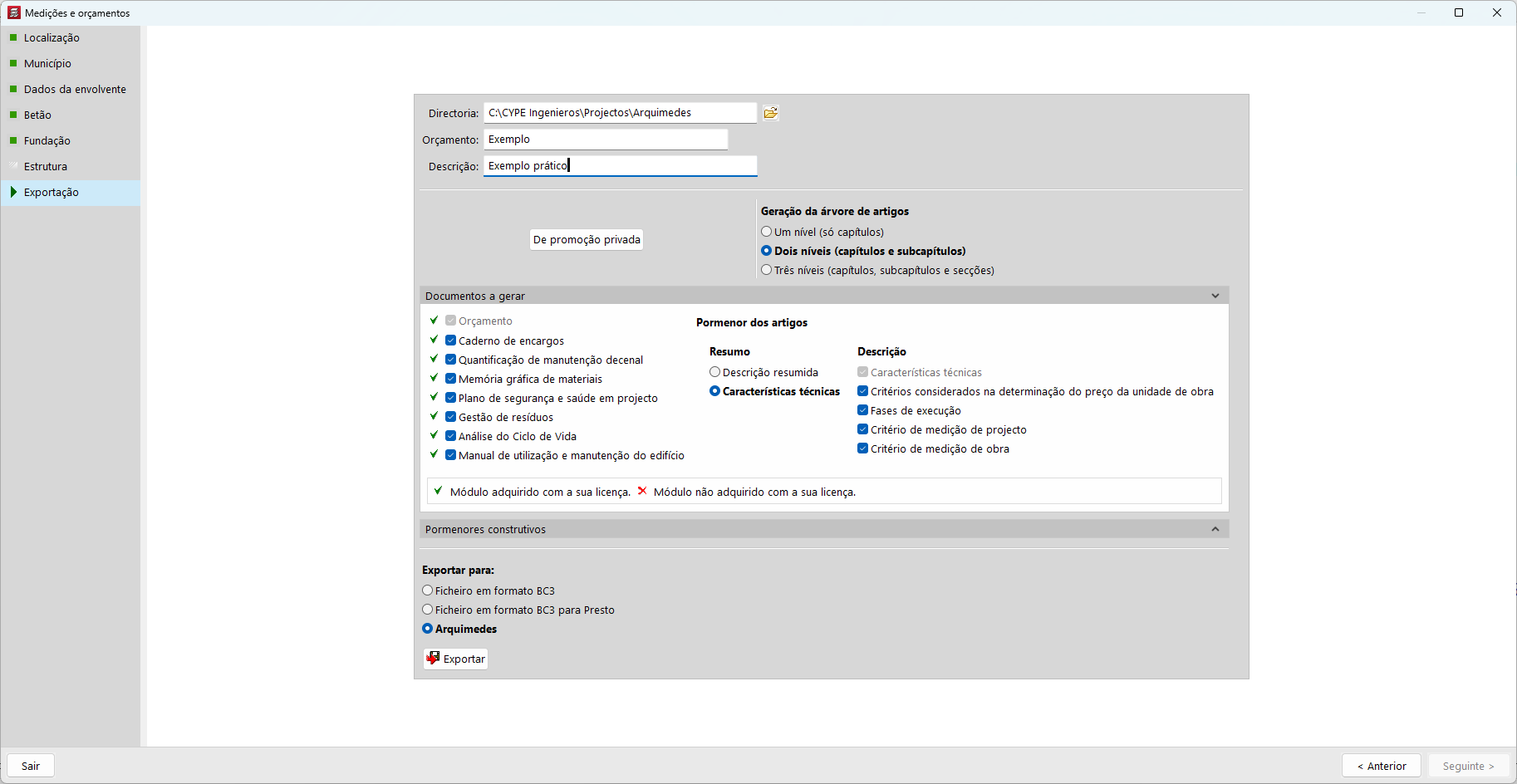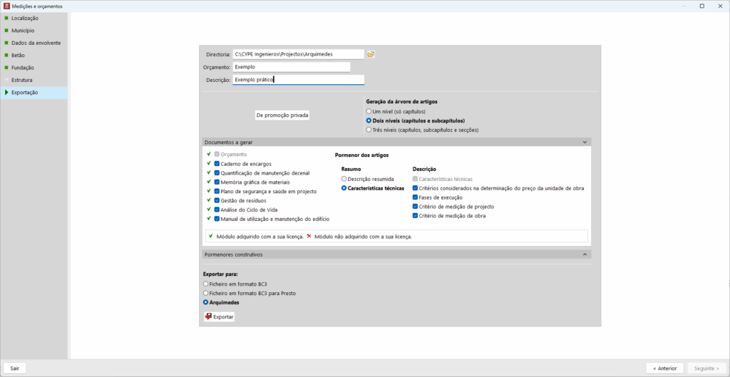 Para exportar a informação relativa ao Caderno de encargos, à Quantificação da manutenção decenal, à Memória gráfica de materiais, ao Plano de segurança e saúde em projecto, à Gestão de resíduos, à Análise do Ciclo de Vida e ao Manual de utilização e manutenção do edifício, a sua licença de utilização deve incluir os módulos correspondentes.