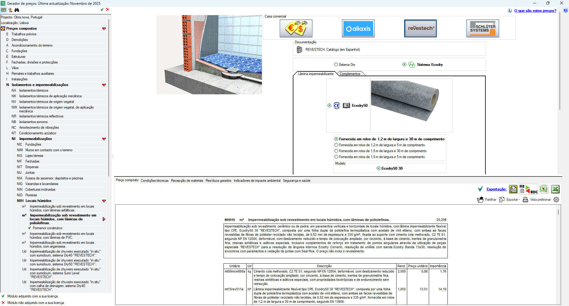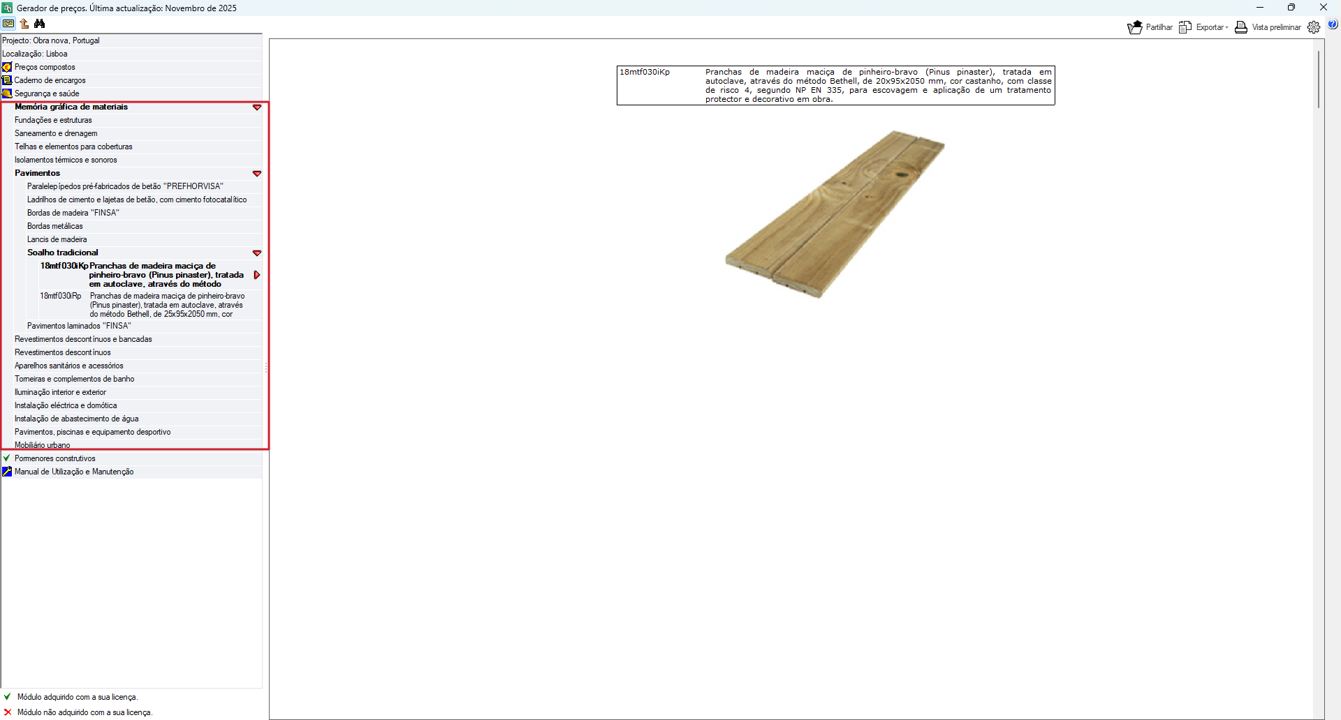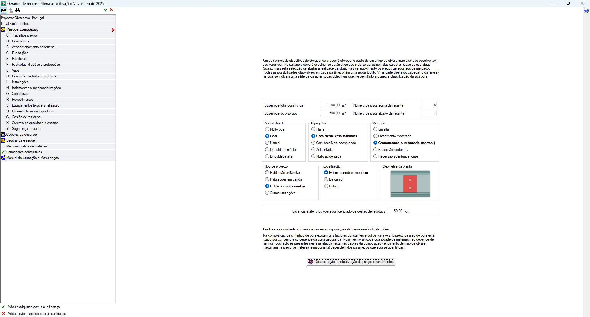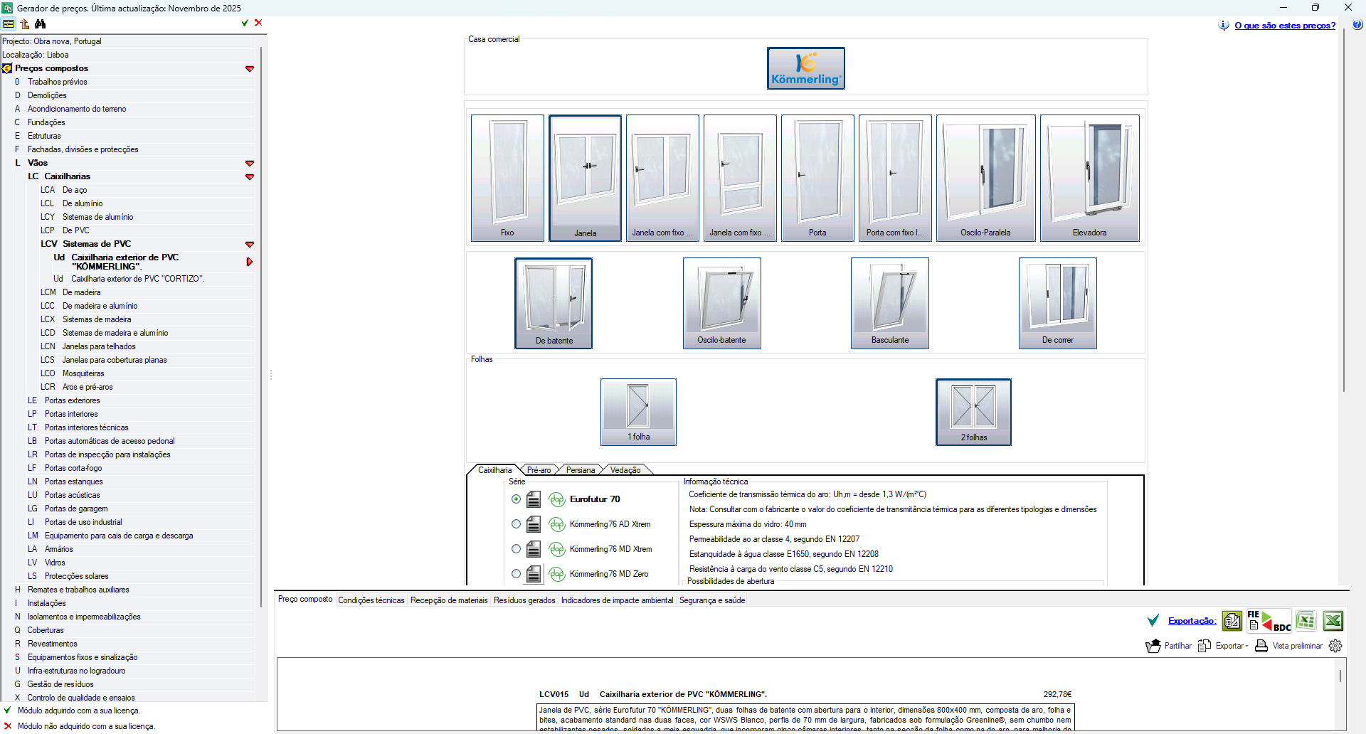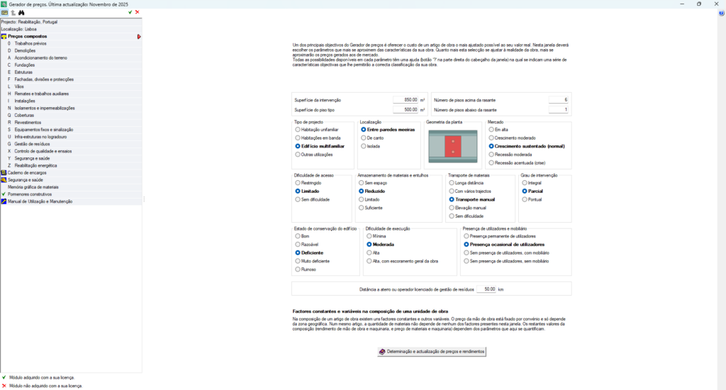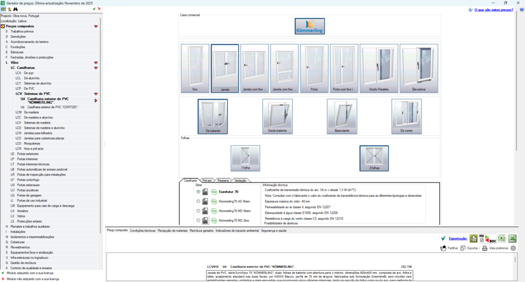 A unidade de obra deixa de ser uma solução genérica e adapta-se às características reais do projeto, através da seleção de múltiplos parâmetros técnicos, como materiais, dimensões, prestações, etc. - Atualização automática do preço