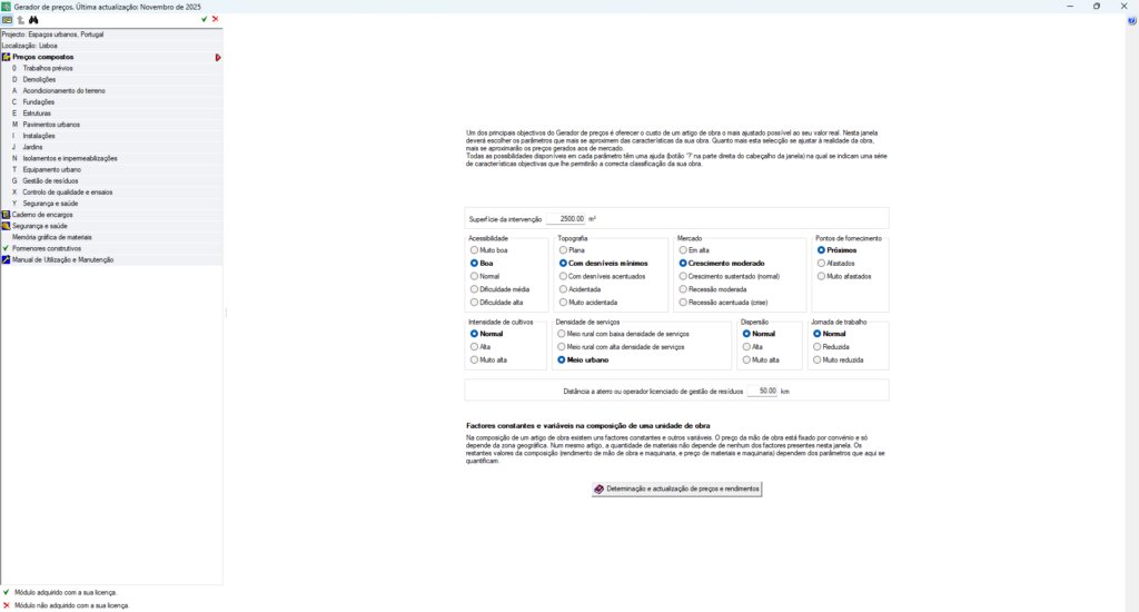 Os parâmetros que podem ser selecionados dependerão da versão previamente escolhida no Gerador de preços, seja «Obras novas», «Reabilitação» ou «Espaços urbanos».