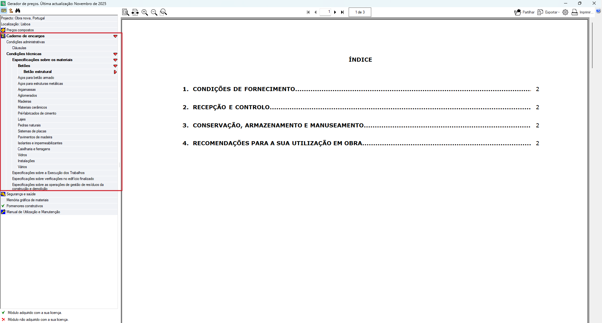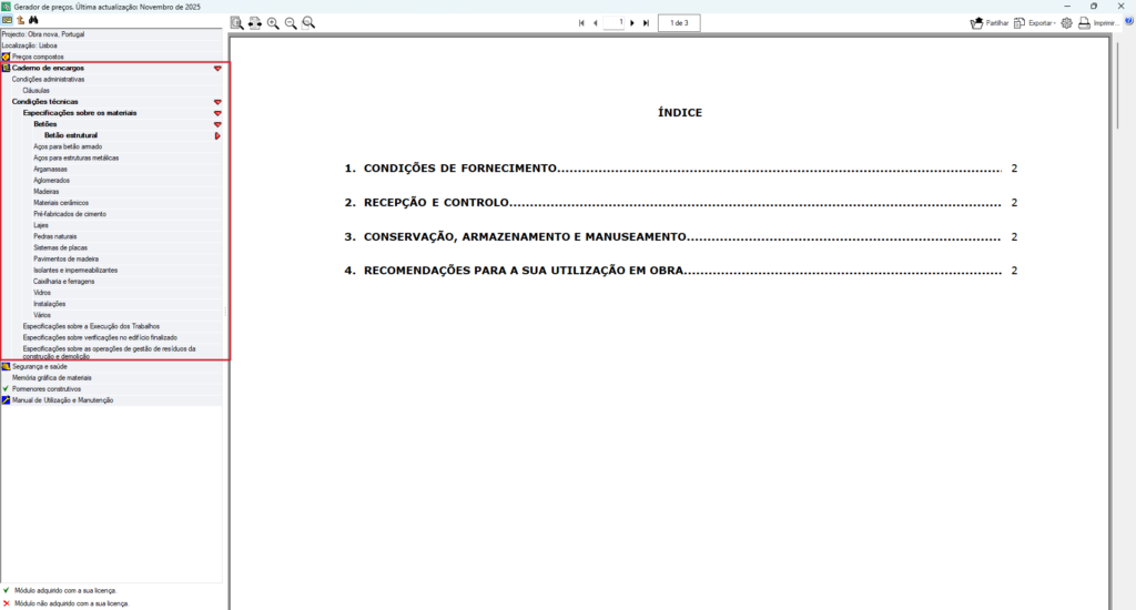 A secção "Caderno de encargos" fornece informações detalhadas sobre os requisitos dos materiais, equipamentos e sistemas de construção, as condições de execução das diferentes unidades de obra e as verificações e testes necessários para garantir o cumprimento das normas e padrões de qualidade. Esta secção é essencial para garantir que as soluções propostas cumprem os requisitos legais e técnicos aplicáveis no país em questão.