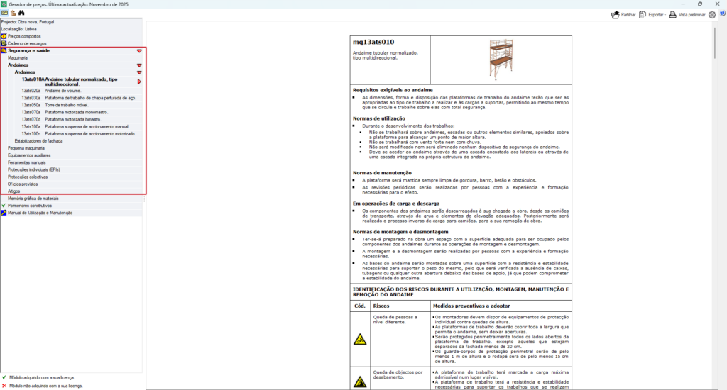 Além disso, a partir do menu lateral e de cada unidade de obra, é possível extrair informações sobre especificações técnicas, caderno de encargos, segurança e saúde ou pormenores construtivos, entre outros.