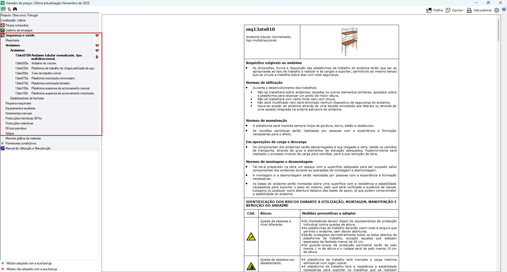O separador "Segurança e saúde" fornece orientações completas sobre os protocolos e procedimentos a seguir para garantir a segurança durante a execução de determinados trabalhos relacionados com uma unidade de obra. Estes protocolos estão estruturados da seguinte forma: