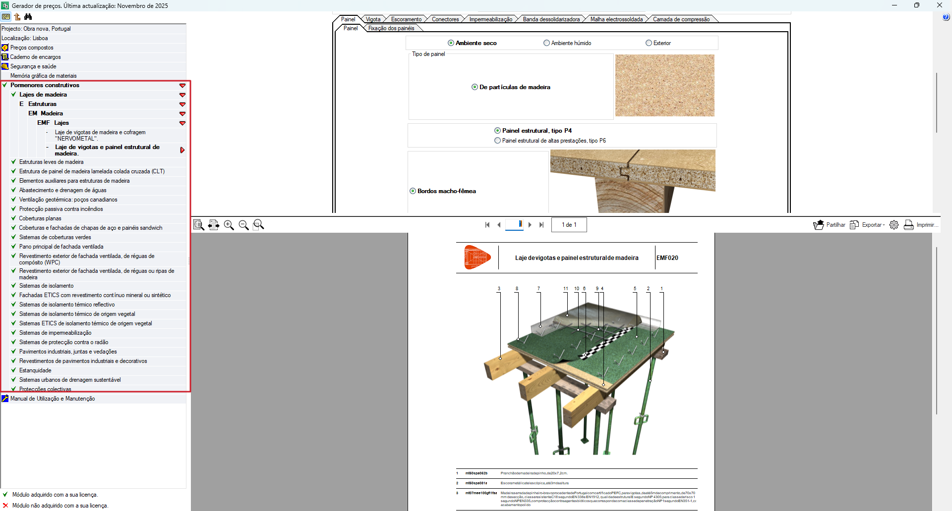 A interface desta secção está subdividida em três partes. À esquerda está o menu lateral em árvore e à direita, dividido em dois, está o sistema de seleção paramétrico na parte superior e a unidade de obra selecionada na parte inferior.