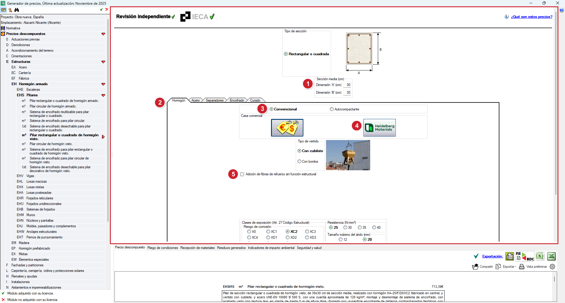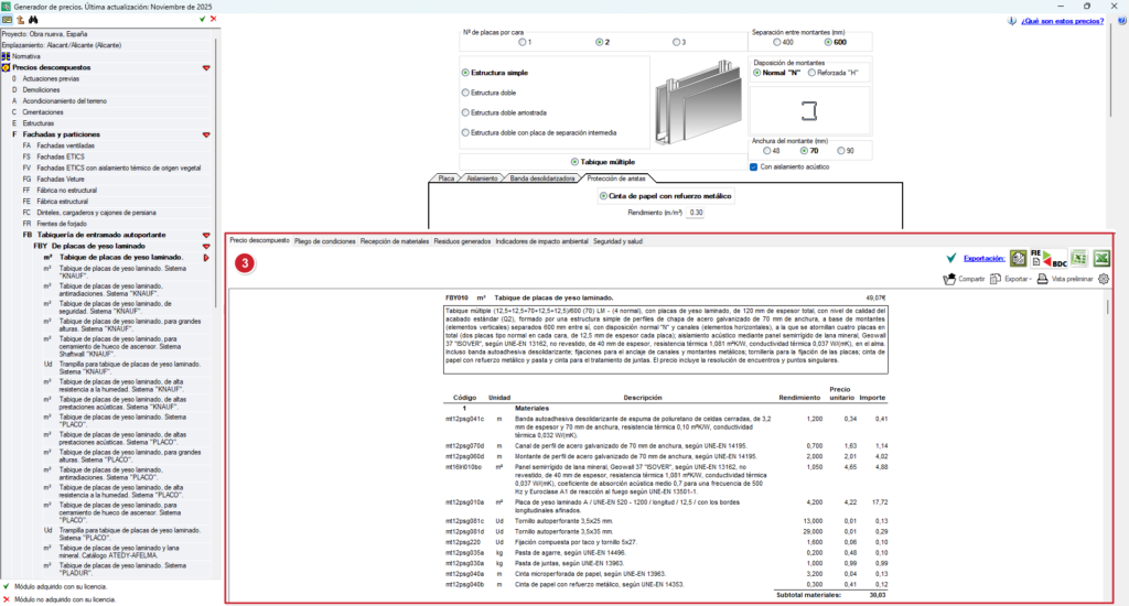 Através da combinação destes parâmetros, é gerada automaticamente a unidade de obra concreta, ajustada às características selecionadas, e atualizados em tempo real o seu preço desagregado e as informações associadas.