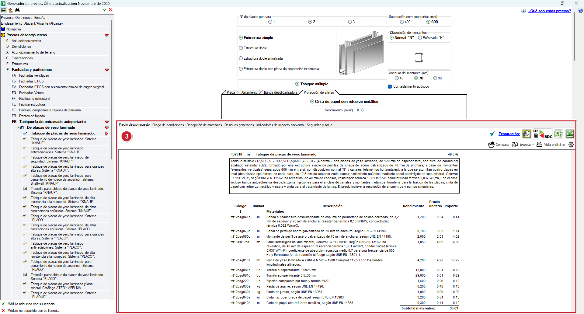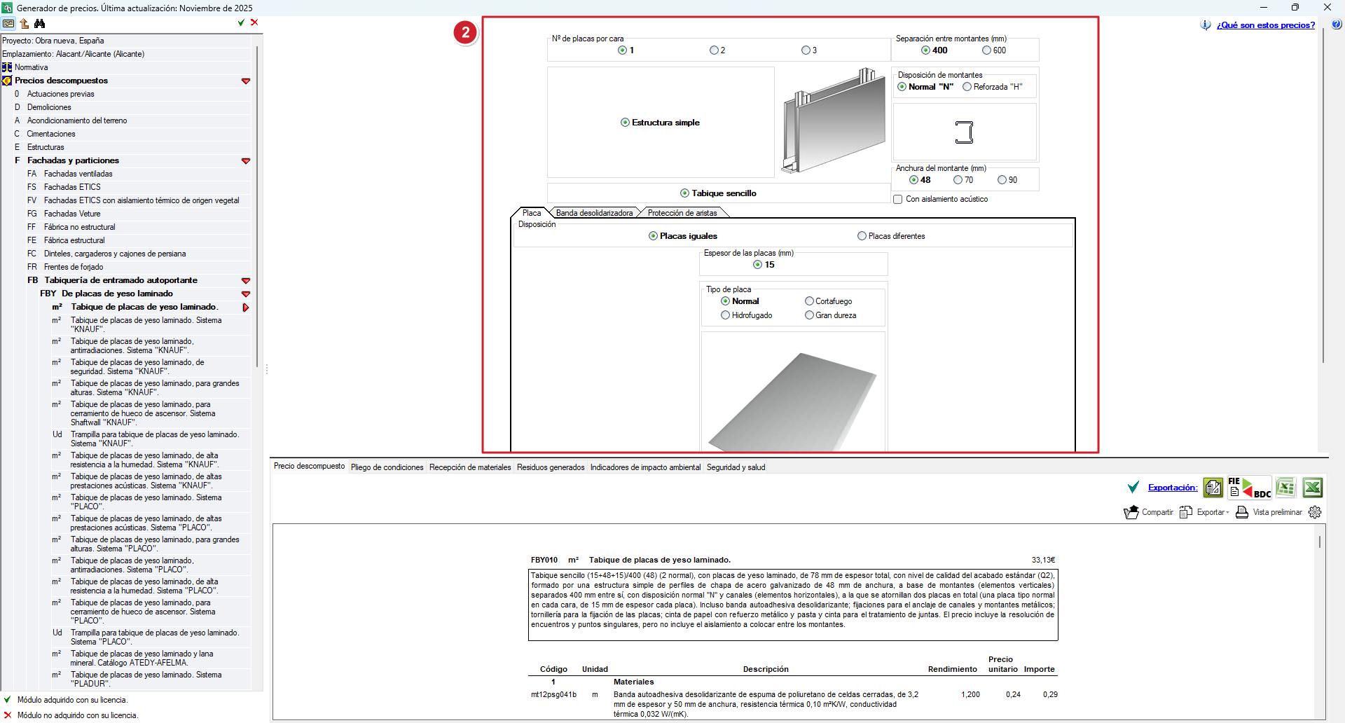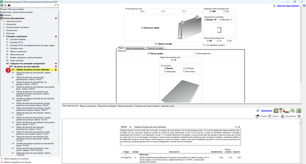 - No menu em árvore, selecione a unidade de obra correspondente, por exemplo, FBY010 – Divisória de placas de gesso laminado.