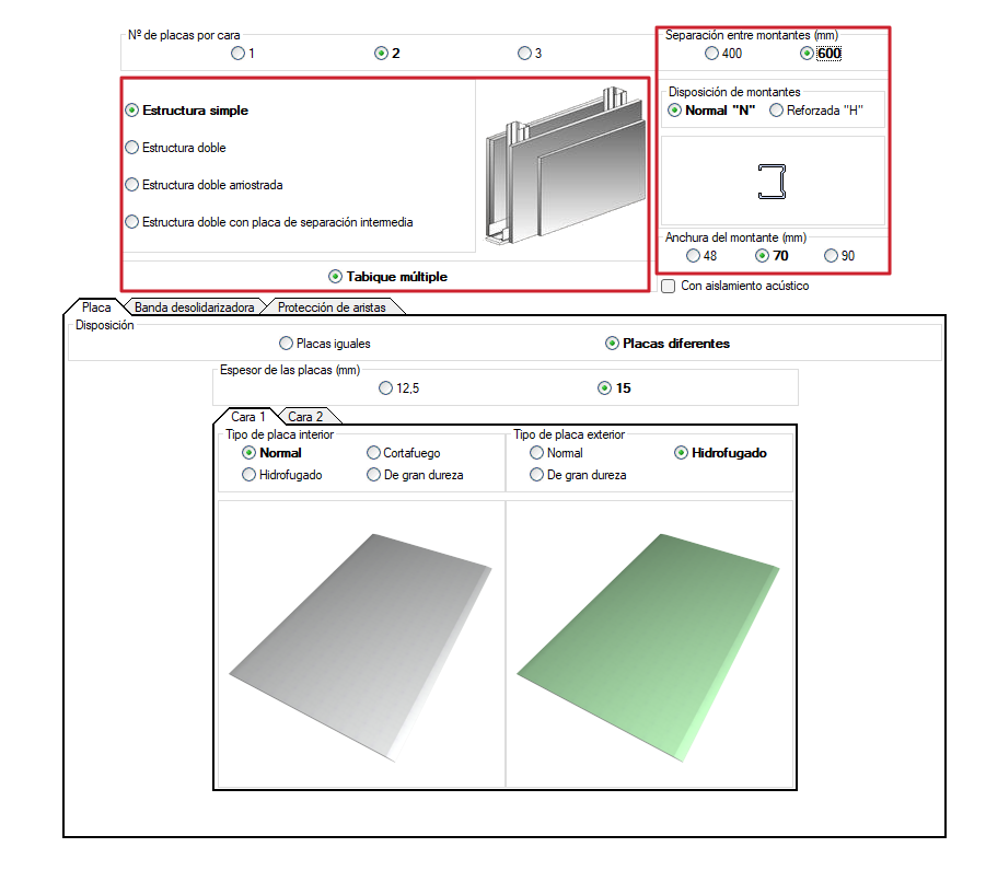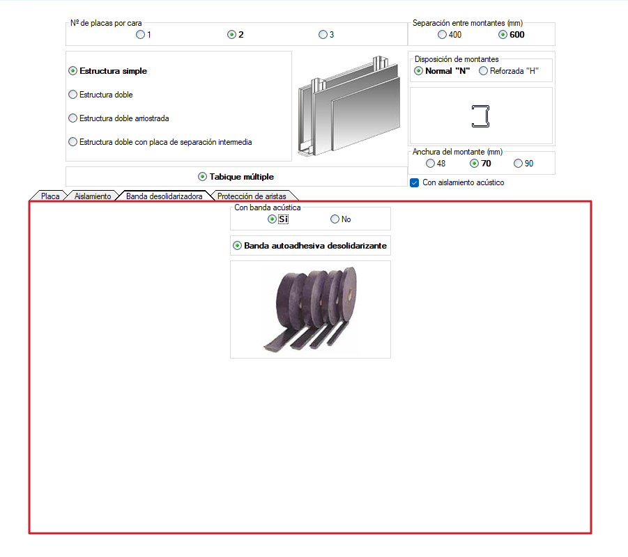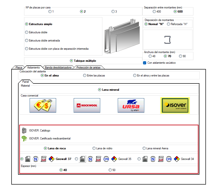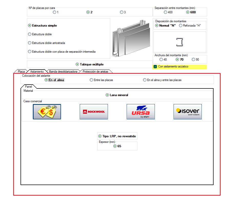 Suponhamos a definição de uma divisória autoportante de placas de gesso laminado com isolamento acústico.