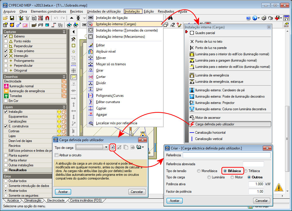 Implementou-se a possibilidade de se introduzir cargas genéricas bifásicas (menu Instalação> Instalação interna (Cargas)> Carga definida pelo utilizador> Criar carga).