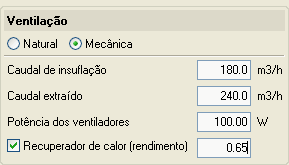 - Ventilação mecânica. Possibilidade de definição de caudais de insuflação e extracção, assim como a potência dos ventiladores e eficiência do recuperador de calor para cálculo das renovações de ar.