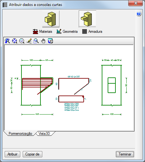 Implementou-se a opção Atribuir dados a consolas curtas (separador Entrada de vigas> menu Vigas/Muros> opção Consolas curtas). Esta opção abre uma janela com o mesmo nome onde se podem definir os materiais, a geometria e a armadura de uma consola curta para atribuir (mediante o botão Atribuir) a qualquer consola curta que se tenha introduzido.