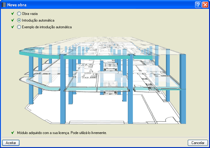 Este módulo foi preparado para a geração automática da estrutura (pilares, distribuição de plantas, cargas gerais, vigas de contorno e vigas de aberturas interiores). Tudo isto é possível após a solicitação ao utilizador dos dados gerais que definem a estrutura e interpretação, por parte do programa, dos desenhos de arquitectura em formato DXF ou DWG.