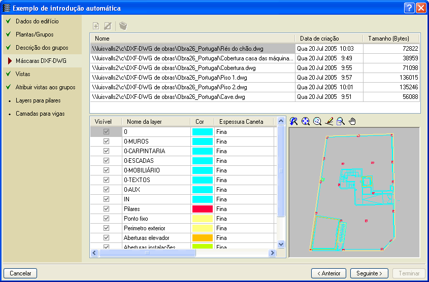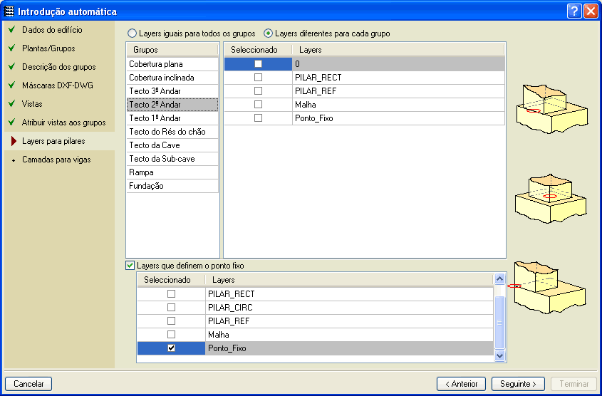 Com toda esta informação o programa gera automaticamente a geometria da estrutura (pilares e vigas), inclusive deduz os pontos fixos dos pilares se as suas dimensões forem diferentes em cada planta definida nos DXF ou DWG. Também é possível indicar uma layer que contenha a definição de pontos fixos de pilares para que não se calculem automaticamente.