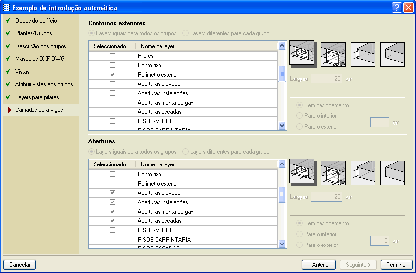 É possível seleccionar que tipo de vigas constituem o contorno exterior e interior, e inclusive, definir opcionalmente um deslocamento da viga relativamente à linha de contorno, sendo muito útil no caso em que o contorno desenhado no DXF ou DWG representa o bordo da fachada e não o bordo estrutural.