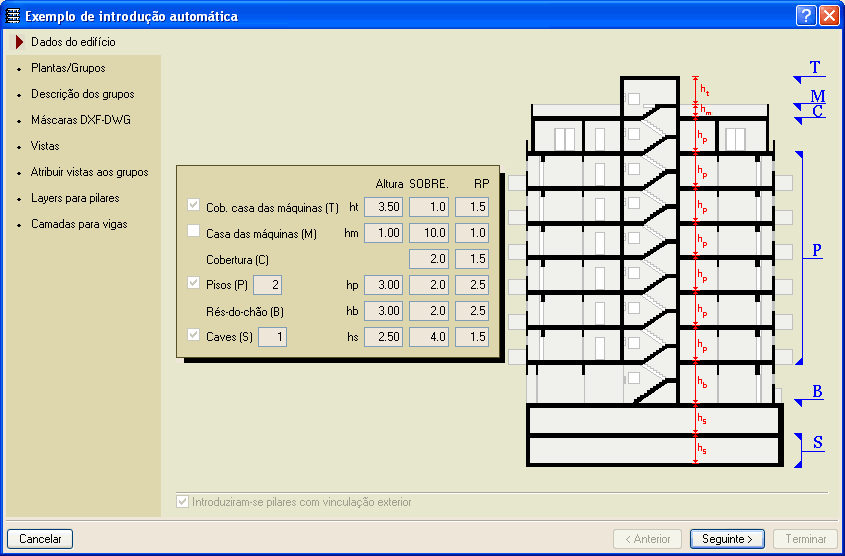 O utilizador define a composição das plantas da estrutura: caves, r/c, pisos, cobertura, laje de piso e cobertura da casa das máquinas. Salvo o r/c e a cobertura, o resto das plantas são opcionais. Indicam-se também as alturas, sobrecargas, cargas de revestimentos e paredes divisórias de cada piso.