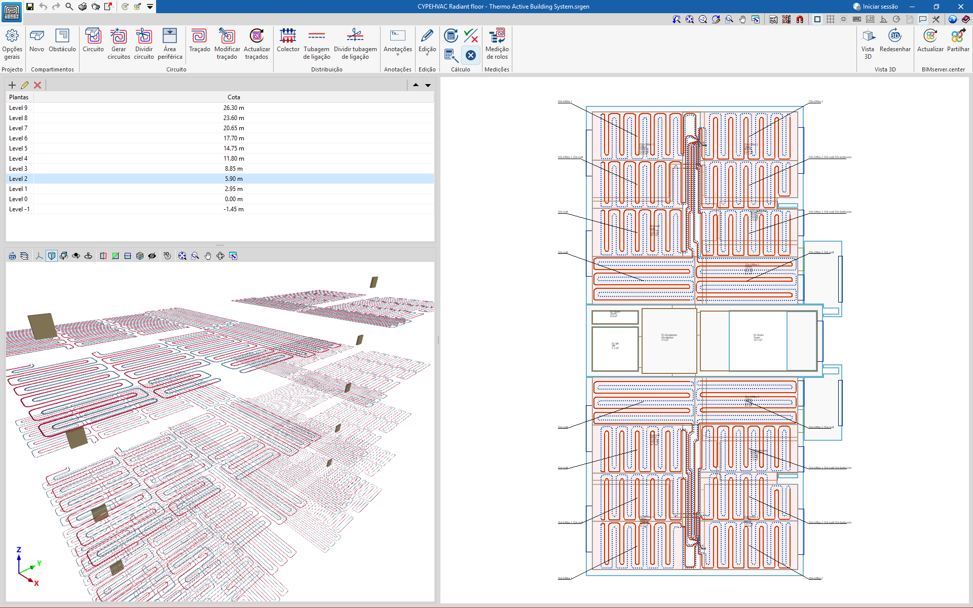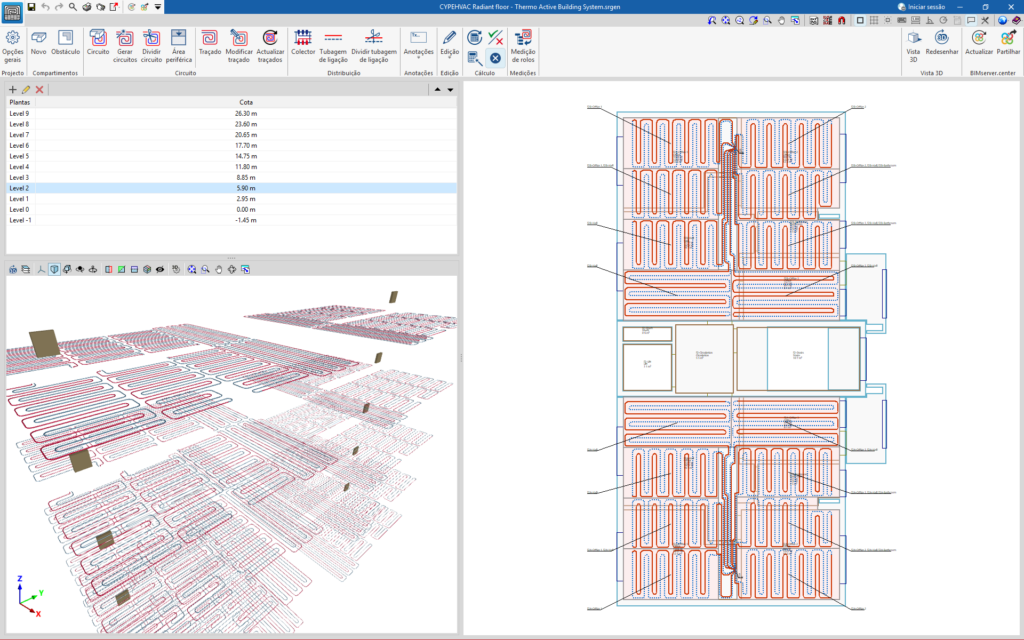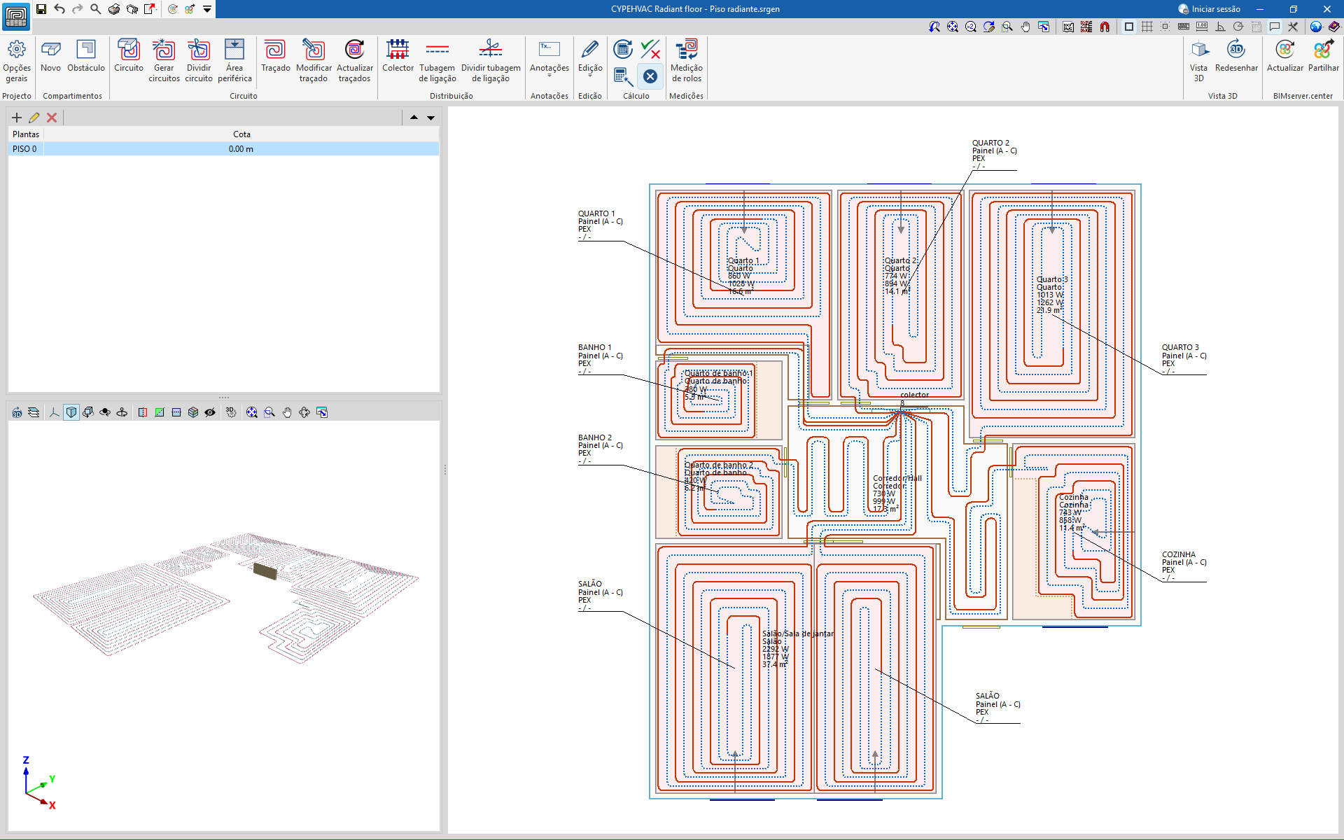 - Disposição dos coletores de piso radiante (em "Distribuição", "Coletor") em cada planta na área de trabalho.