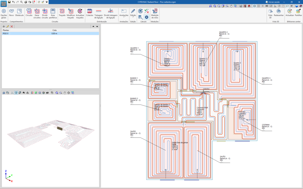 - Introdução e disposição dos circuitos de piso radiante nos compartimentos apresentados em cada planta na área de trabalho. Pode ser feito de duas formas: