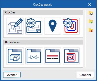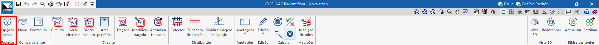 No bloco “Projeto” da barra de ferramentas principal, encontra-se a opção “Opções gerais”, que permite configurar as opções gerais do projeto, bem como aceder à gestão das bibliotecas de tipos de compartimentos e de elementos da instalação: